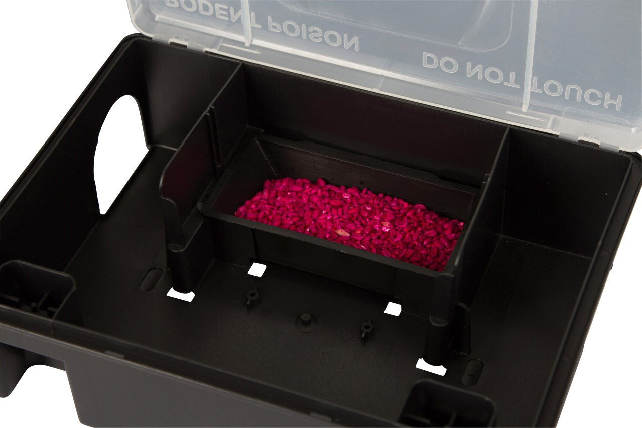 Kombineret rottefælde (kraftig smækfælde) og rottegiftsdepot.