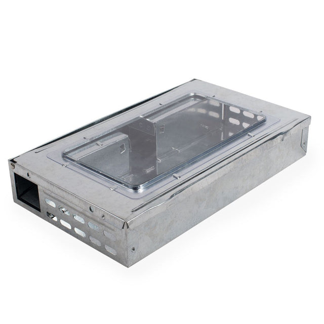 Fælde fremstillet i galvaniseret jern og med stort gennemsigtig plastik låg, hvilket gør det nent at se, om der er mus i fælden.